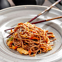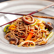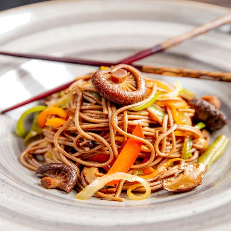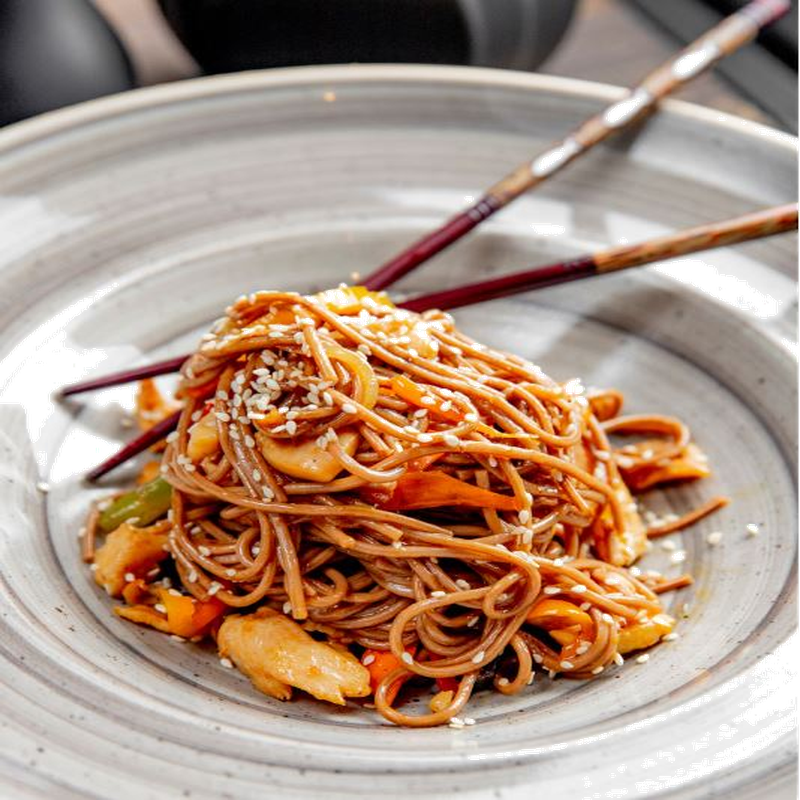 Соба (гречневая) — источник медленных углеводов и растительного белка, богата магнием и клетчаткой. Хороша для энергии и легкого пищеварения. Так же в основе блюда набор овощей (красный лук, морковь, болгаский перец, стучковая фасоль, имбирь и честок), если нужно что-то убрать - пиши в коментарии к заказу.