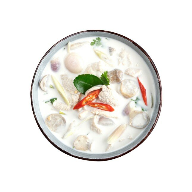 Нежный тайский суп на курином бульоне с кокосовыми сливками, шампиньонами, куриным филе и томатами черри.